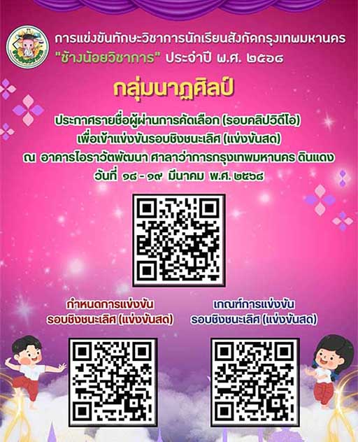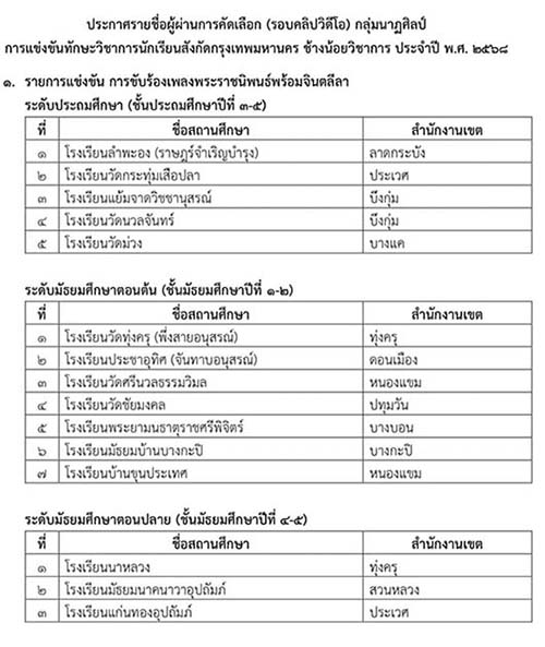 ขอแสดงความยินดีกับนักเรียนโรงเรียนพระยามนธาตุราชศรีพิจิตร์ ที่ผ่านการคัดเลือกรอบคลิปวิดีโอ เพื่อเข้าแข่งขันรอบชิงชนะเลิศ การประกวดแข่งขันทักษะทางวิชาการนักเรียนสังกัดกรุงเทพมหานคร ช้างน้อยวิชาการ ประจำปี 2568 กลุ่มนาฏศิลป์